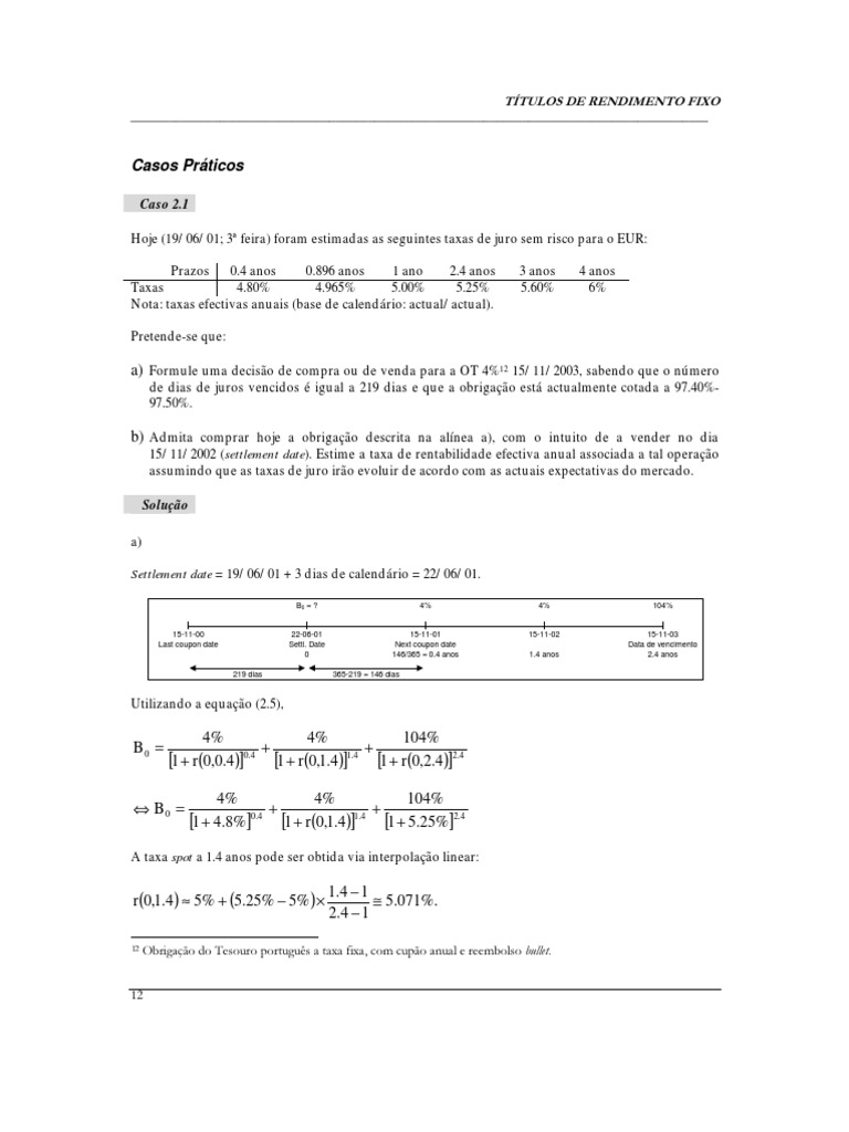 Caso 2.3 Hoje (11/09/01; 3 feira) foram estimadas as seguintes taxas de juro sem risco para o EUR: Prazos 1 ano 2 anos 3 anos 4 anos Taxas 4.50% 5.25% 6.00% 6.50% Nota: taxas efectivas anuais (base de calendrio: ACT/ACT). Pretende-se que: a) Avalie a OT 4% 07/02/2003, sabendo que o cupo tem uma periodicidade anual (ACT/ACT) e que o nmero de dias de juros vencidos igual a 219 dias. Para o efeito considere que a OT 6% 07/02/2002, tambm com cupo anual (ACT/ACT), est cotada a 100.75% (mdia bidask).
