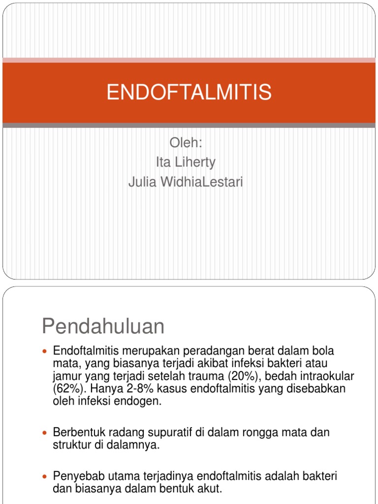 adanya peradangan hebat intraokular, terjadi yang diakibatkan dari bakteri, jamur atau keduanya. Beberapa penulis mendefinisikan sebagai infeksi bakteri atau jamur pada badan dan cairan ruang vitreous mata.