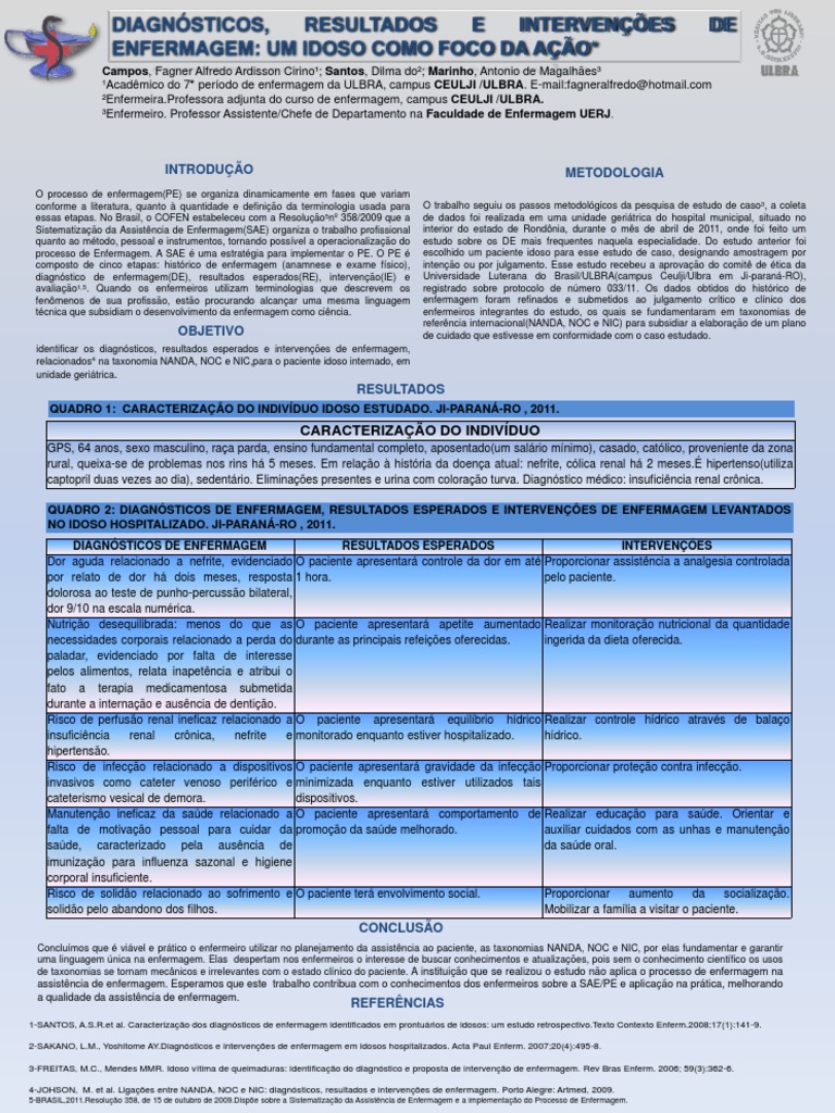Campos, Fagner Alfredo Ardisson Cirino; Santos, Dilma do; Marinho, Antonio de Magalhes Acadmico do 7 perodo de enfermagem da ULBRA, campus CEULJI /ULBRA. E-mail:fagneralfredo@hotmail.com Enfermeira.Professora adjunta do curso de enfermagem, campus CEULJI /ULBRA. Enfermeiro. Professor Assistente/Chefe de Departamento na Faculdade de Enfermagem UERJ.