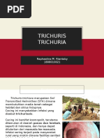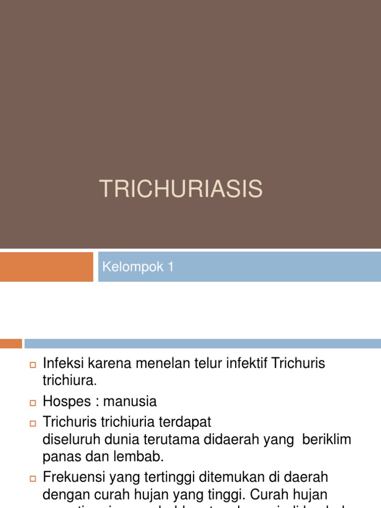 Infeksi karena menelan telur infektif Trichuris trichiura. Hospes : manusia Trichuris trichiuria terdapat diseluruh dunia terutama didaerah yang beriklim panas dan lembab. Frekuensi yang tertinggi ditemukan di daerah dengan curah hujan yang tinggi. Curah hujan yang tinggi menyebabkan tanah menjadi lembab sehingga sangat sesuai untuk pematangan telur cacing.