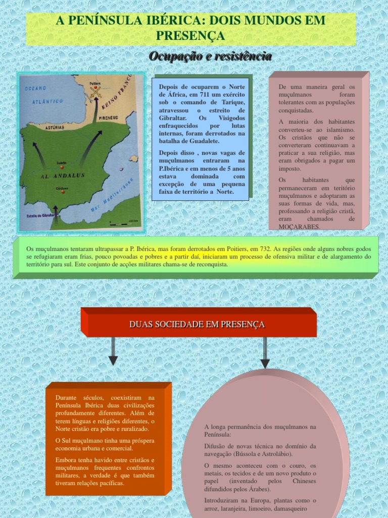 Depois de ocuparem o Norte de frica, em 711 um exrcito sob o comando de Tarique, atravessou o estreito de Gibraltar. Os Visigodos enfraquecidos por lutas internas, foram derrotados na batalha de Guadalete. Depois disso , novas vagas de muulmanos entraram na P.Ibrica e em menos de 5 anos estava dominada com excepo de uma pequena faixa de territrio a Norte. De uma maneira geral os muulmanos foram tolerantes com as populaes conquistadas. A maioria dos habitantes converteu-se ao islamismo. Os cristos que no se converteram continuavam a praticar a sua religio, mas eram obrigados a pagar um imposto. Os habitantes que permaneceram em teritrio muulmanos e adoptaram as suas formas de vida, mas, professando a religio crist, eram chamados de MOARABES.