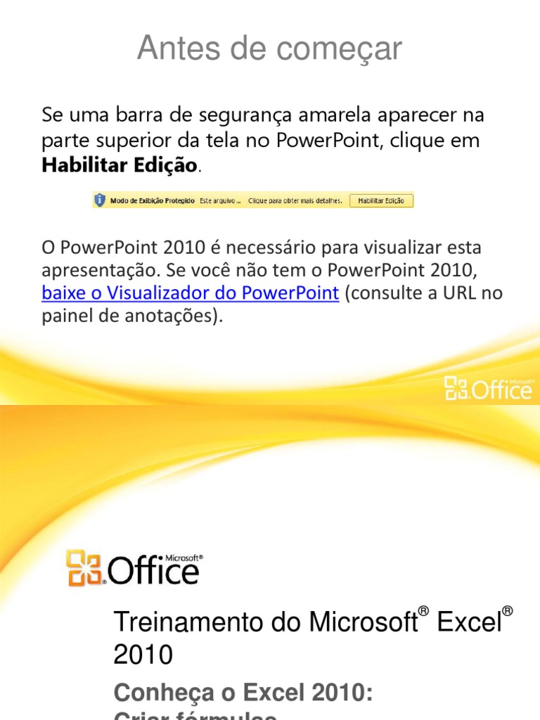 Se uma barra de segurana amarela aparecer na parte superior da tela no PowerPoint, clique em Habilitar Edio.