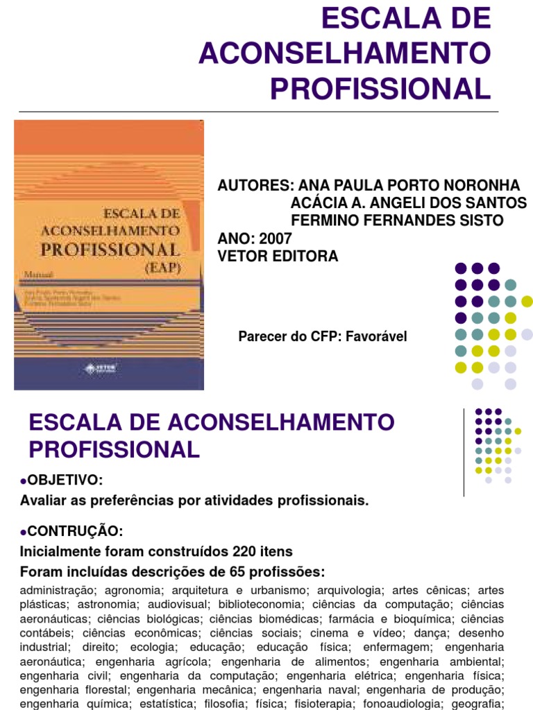 A Escala de Aconselhamento Profissional (EAP) avalia as preferncias por atividades profissionais em 7 reas (dimenses), a saber: 1. Cincias Exatas; 2. Artes/Comunicao; 3. Cincias Biolgicas/da Sade; 4. Cincias Agrrias/Ambientais; 5. Atividade Burocrtica; 6. Cincias Humanas e Sociais Aplicadas e 7. Entretenimento.