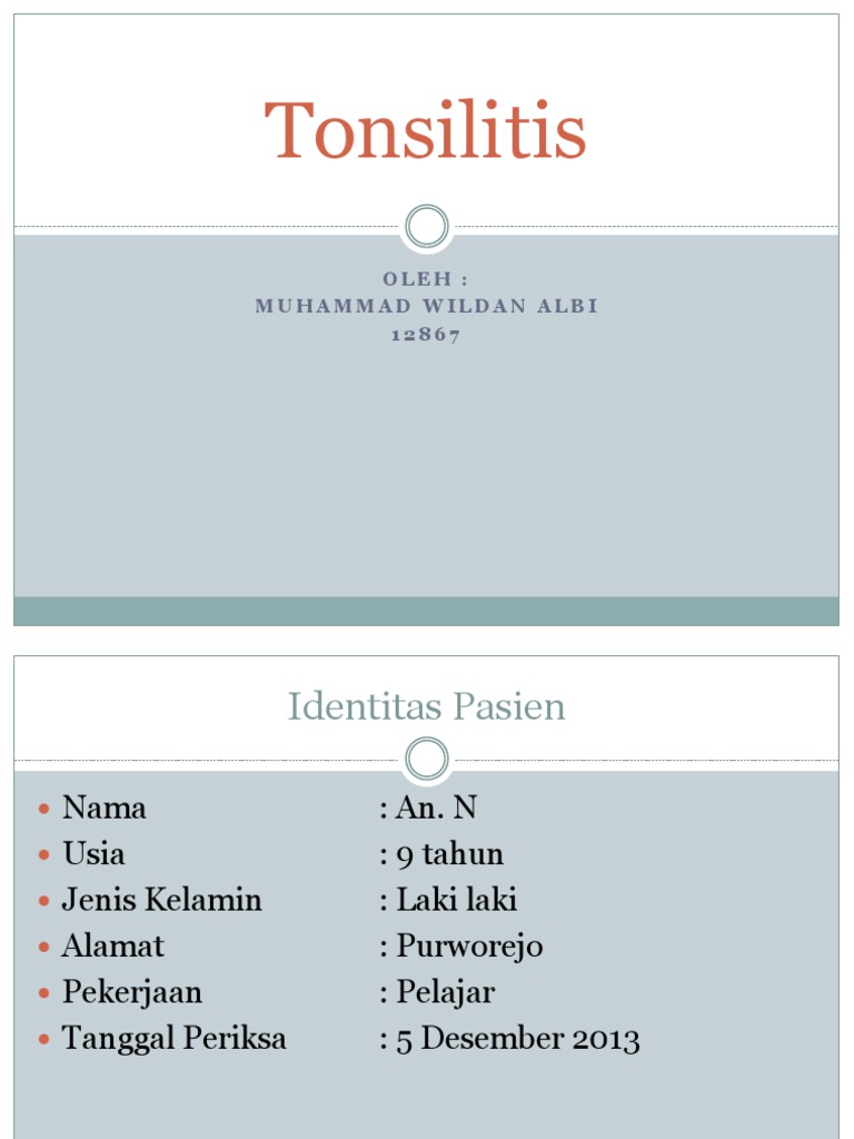 tenggorokan kira kira sudah 7 hari terakhir. 8 bulan terakhir OS sering mengalami demam, hampir setiap bulan demam (+) 4 bulan terakhir orang tua OS menyadari bahwa setiap OS demam tinggi OS mengorok (+), mengantuk ketika di sekolah (+), sudah diobati dengan obat demam namun masih kambuh lagi (+). 1MSMRS OS demam tinggi (+), naik turun sampai HMRS. HMRS nyeri telan (+), batuk (+) kadang, tidur mendengkur (+), mulut berbau (+), keluhan telinga disangkal (-), keluhan hidung disangkal (-).