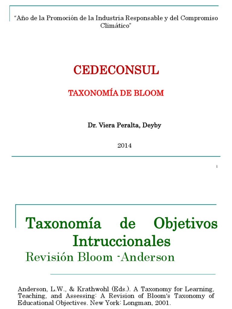 La Taxonomía de Bloom revisada por Anderson Niveles originales de Bloom: Conocimiento Comprensión Aplicación Análisis Síntesis Evaluación Niveles revisados por Anderson (2001): Memorizar Comprender Aplicar Analizar Evaluar Crear .