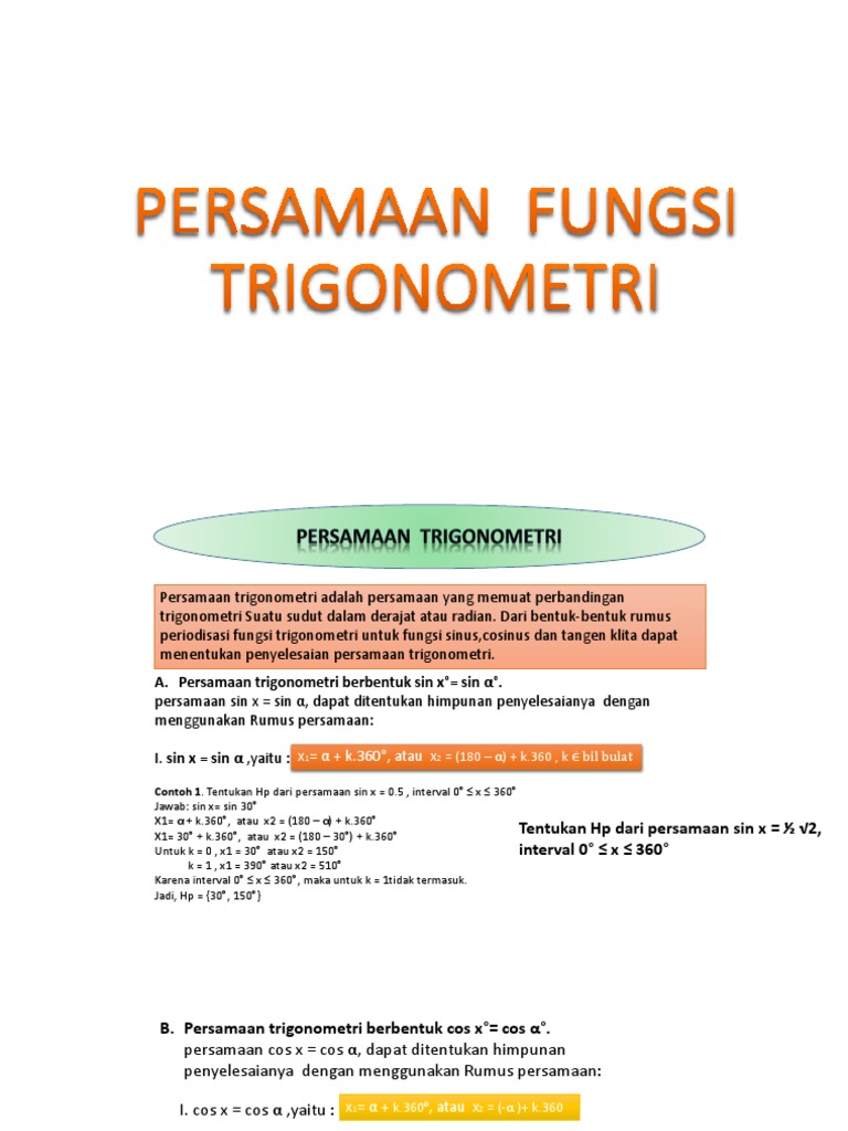 I. sin x = sin α ,yaitu : x1= α + k.360°, atau x2 = (180 – α) + k.360 , k ⋵ bil bulat