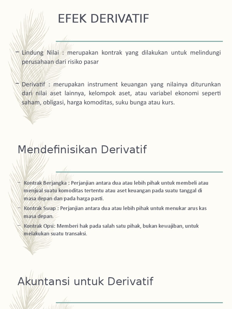– Derivatif : merupakan instrument keuangan yang nilainya diturunkan