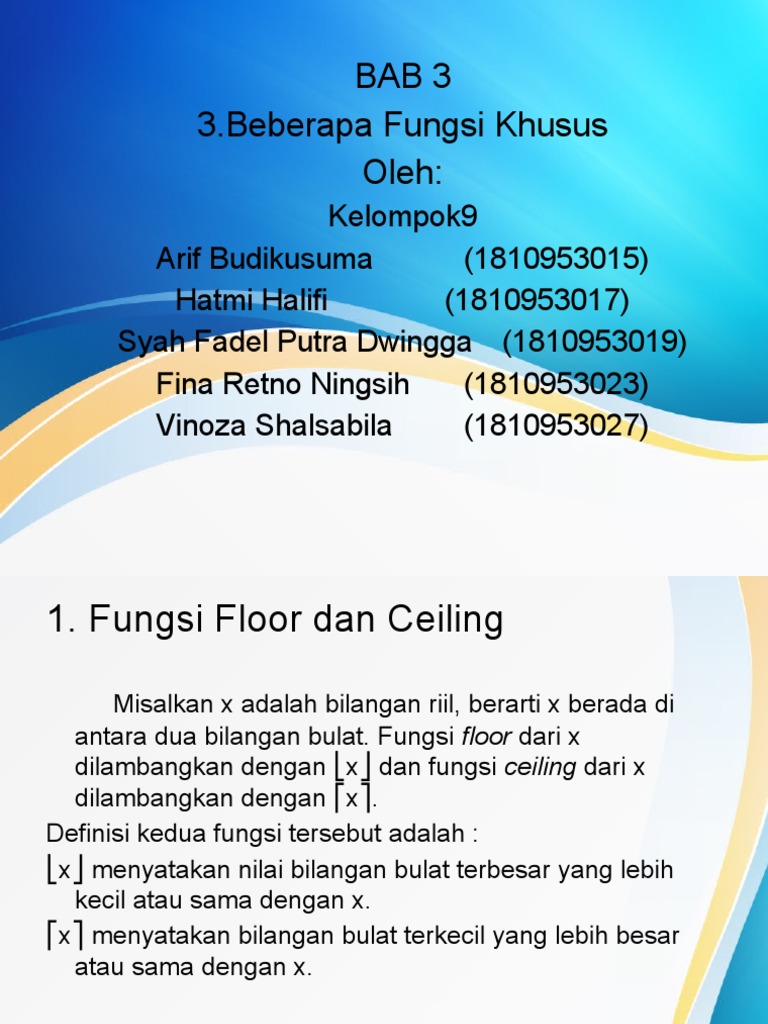bawah, sedangkan fungsi ceiling membulatkan x ke atas.