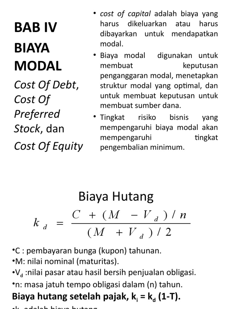 Biaya hutang setelah pajak, ki = kd (1-T).