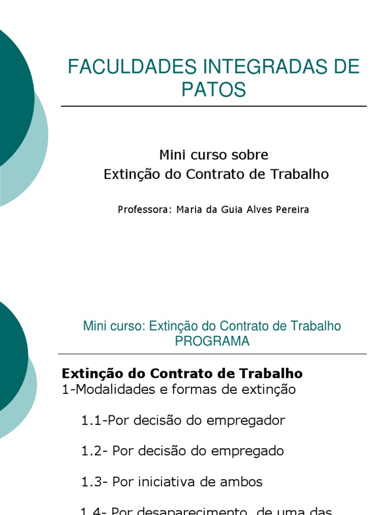 Mini curso: Extino do Contrato de Trabalho PROGRAMA Extino do Contrato de Trabalho 1-Modalidades e formas de extino 1.1-Por deciso do empregador