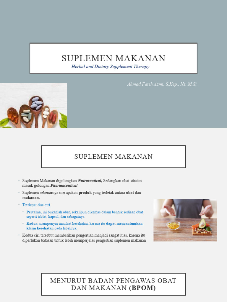 • Suplemen sebenarnya merupakan produk yang terletak antara obat dan