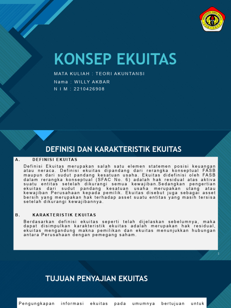 Berdasarkan definisi ekuitas seperti telah dijelaskan sebelumnya, maka
