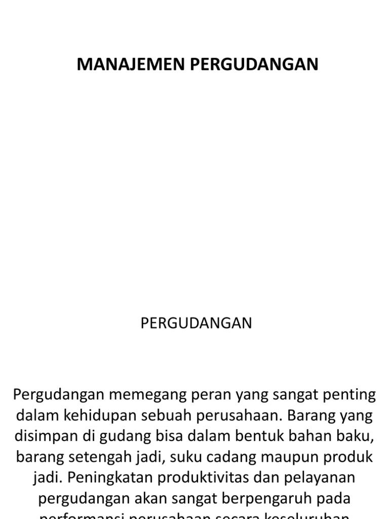 Pergudangan memegang peran yang sangat penting dalam kehidupan sebuah perusahaan. Barang yang disimpan di gudang bisa dalam bentuk bahan baku, barang setengah jadi, suku cadang maupun produk jadi. Peningkatan produktivitas dan pelayanan pergudangan akan sangat berpengaruh pada performansi perusahaan secara keseluruhan