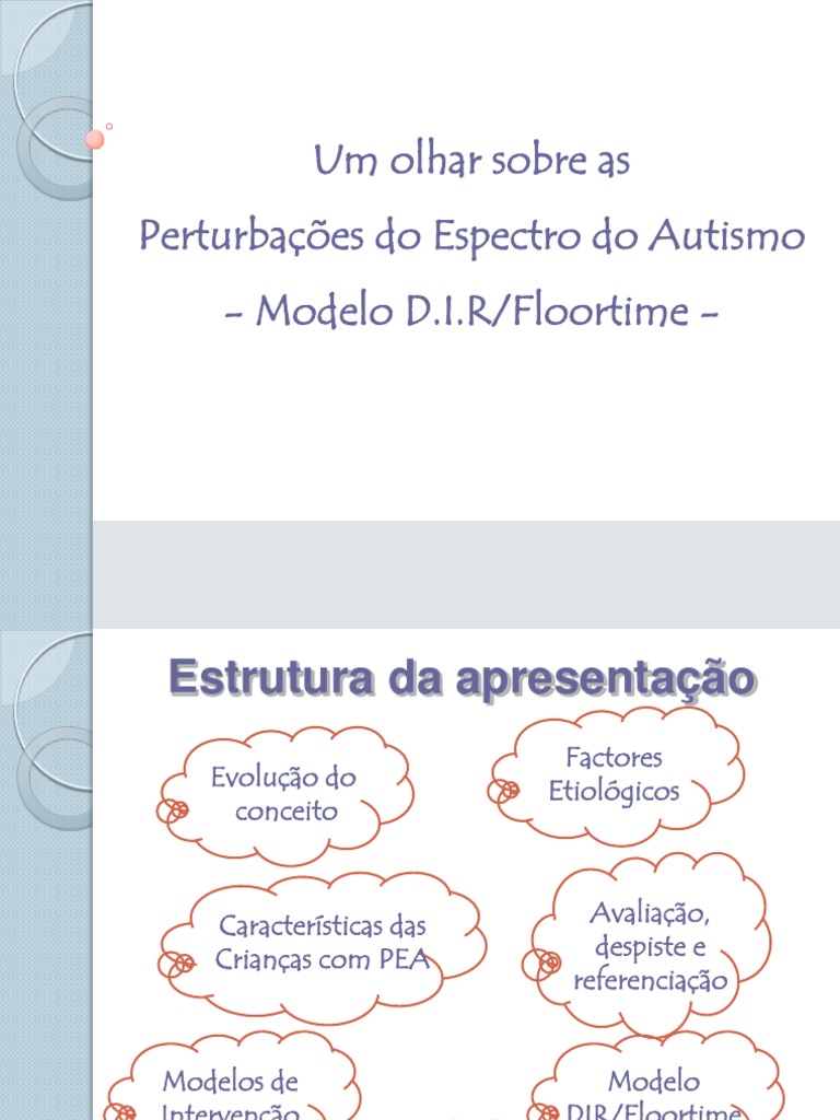 O Modelo DIR tem como objectivo levar a criana com PEA a desenvolver um sentido dela prpria, como um indivduo intencional e interactivo, bem como, desenvolver as suas capacidades cognitivas, sociais e de linguagem Greenspan e Wieder, 2006).