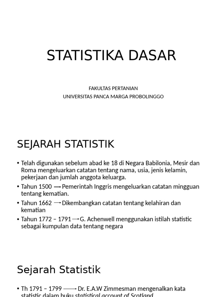 • Awalnya statistic diartikan sebagai keterangan-keterangan yang