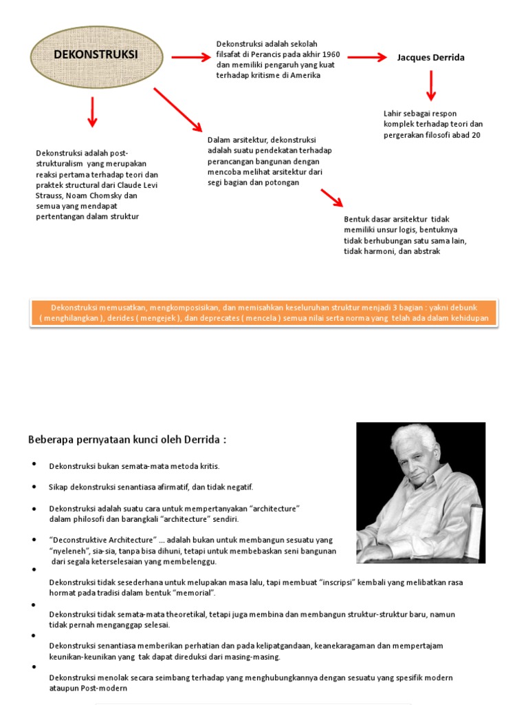 Pentingnya perbedaan, keterbedaan dari yang lain. Bentuk asemantik. Memperlihat kedekonstruksiannya dengan kesan tulisan yang didapat dari bangunan. Tiap arsiteknya memiliki hak penuh atas desain bangunannya. Menaklukkan suatu kasus perancangan. Terpecah-pecah, terbagi-bagi (fragmented), tidak jelas bentuknya (destructive). Arsitek adalah metafisika.