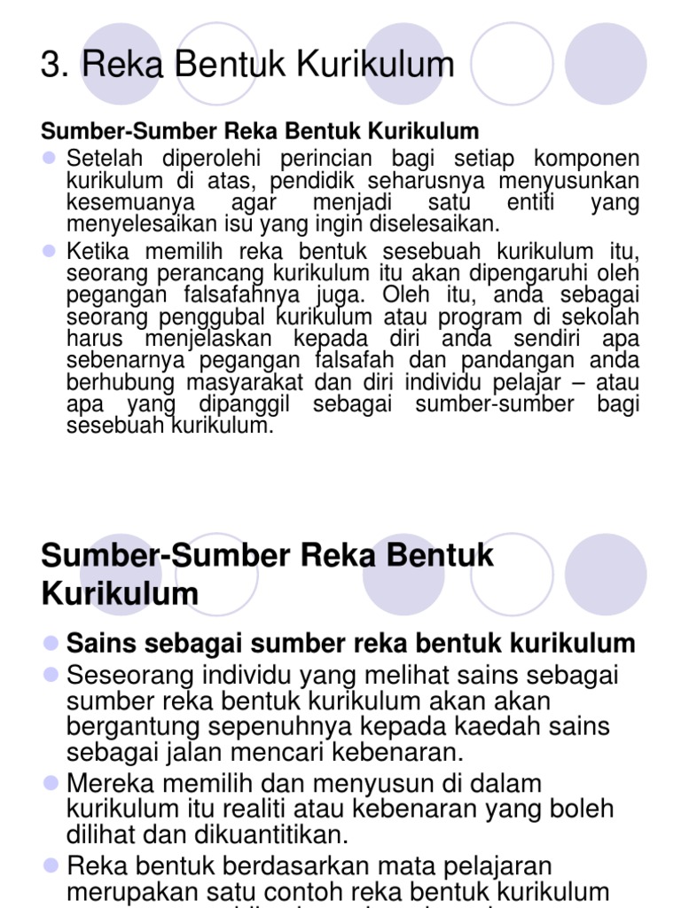 Sumber-Sumber Reka Bentuk Kurikulum Setelah diperolehi perincian bagi setiap komponen kurikulum di atas, pendidik seharusnya menyusunkan kesemuanya agar menjadi satu entiti yang menyelesaikan isu yang ingin diselesaikan. Ketika memilih reka bentuk sesebuah kurikulum itu, seorang perancang kurikulum itu akan dipengaruhi oleh pegangan falsafahnya juga. Oleh itu, anda sebagai seorang penggubal kurikulum atau program di sekolah harus menjelaskan kepada diri anda sendiri apa sebenarnya pegangan falsafah dan pandangan anda berhubung masyarakat dan diri individu pelajar atau apa yang dipanggil sebagai sumber-sumber bagi sesebuah kurikulum.